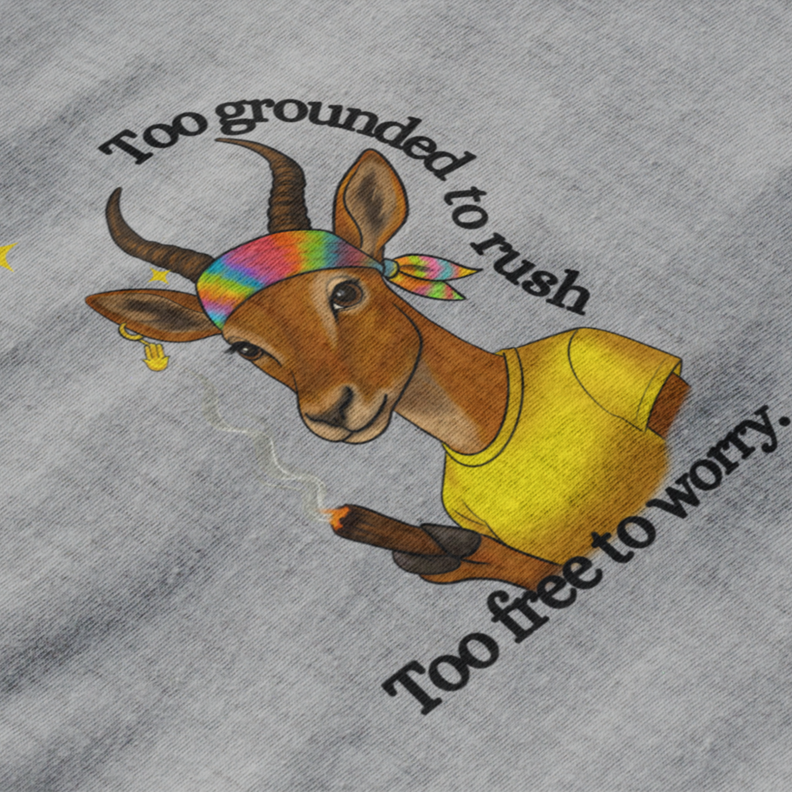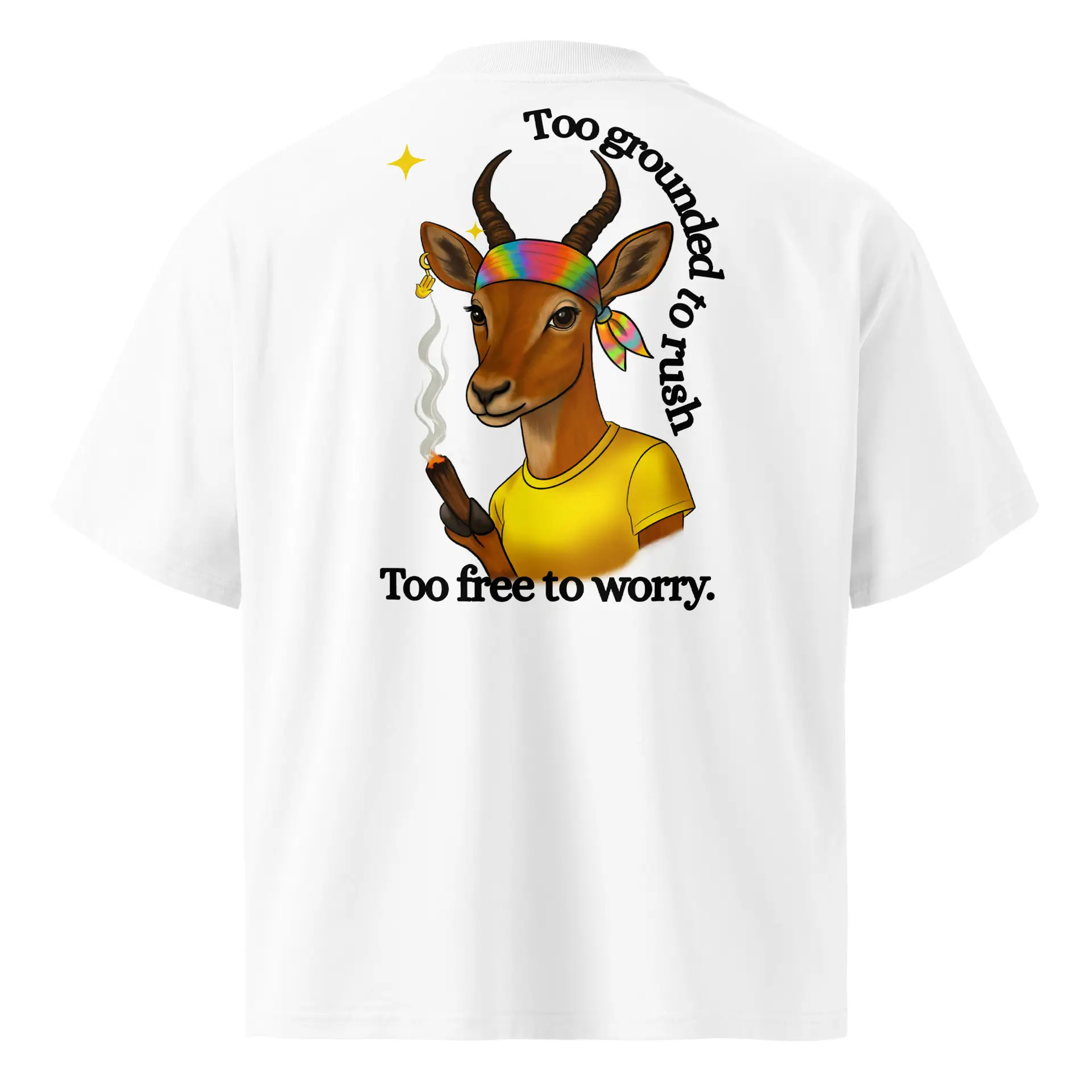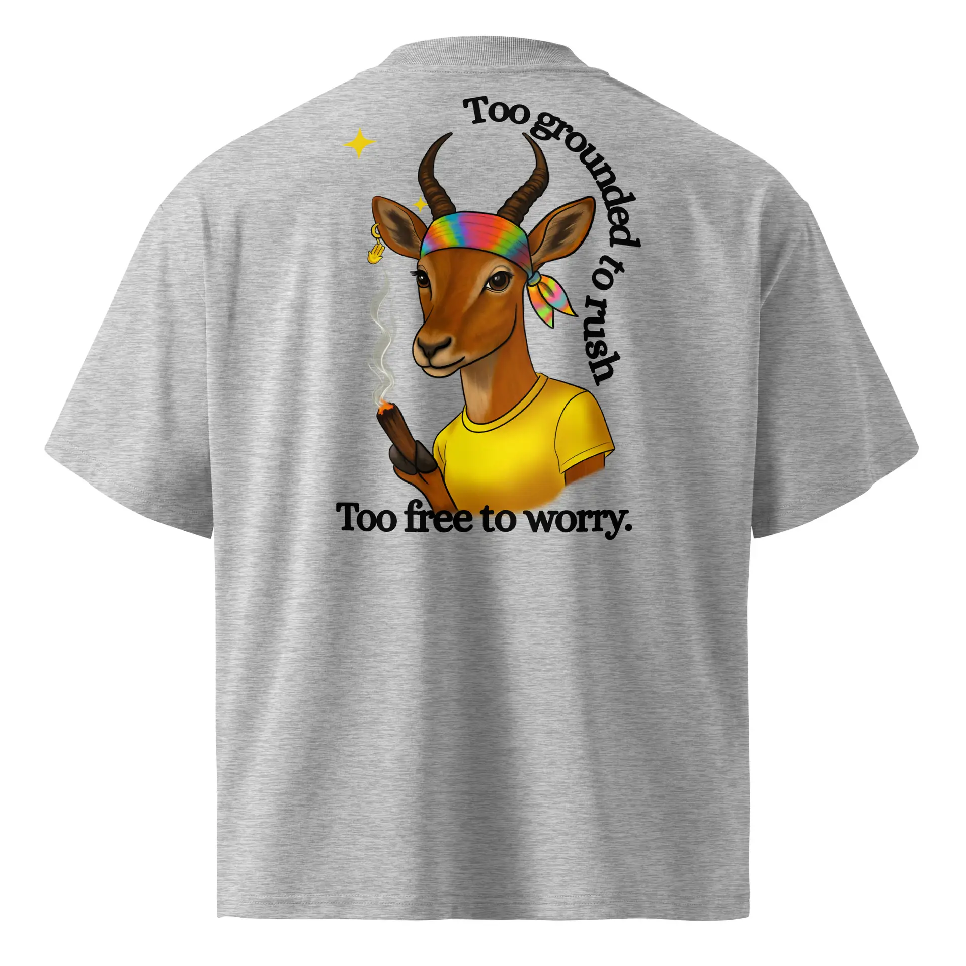 The Grounded Gazelle T-Shirt is a whole state of mind—balanced, unhurried, and untouchably free. With its earthy tones and oversized fit, it’s designed for those who move through life at their own pace, guided by intuition rather than pressure. The gazelle graphic, crowned with a rainbow bandana and holding a moment of calm, reminds us that being grounded means you never have to rush, and being free means you never have to worry. Made in soft stone-colored cotton, this tee blends comfort with attitude, delivering Regalioso’s promise of originality and soulful design. Perfect for wanderers, thinkers, and anyone who believes that peace is the ultimate rebellion, it’s more than just a shirt—it’s a wearable mantra.