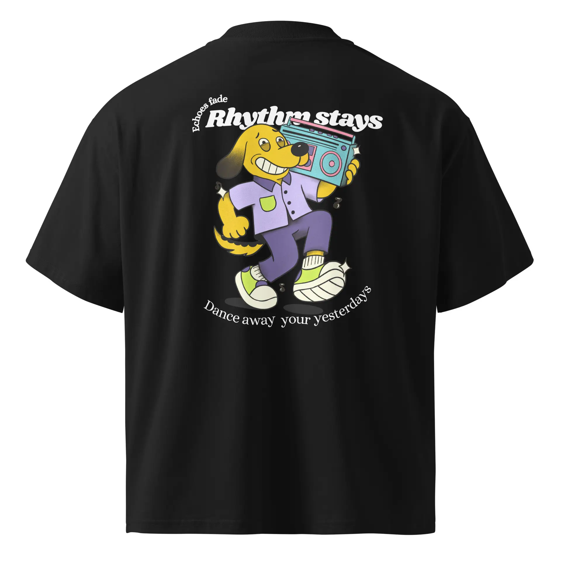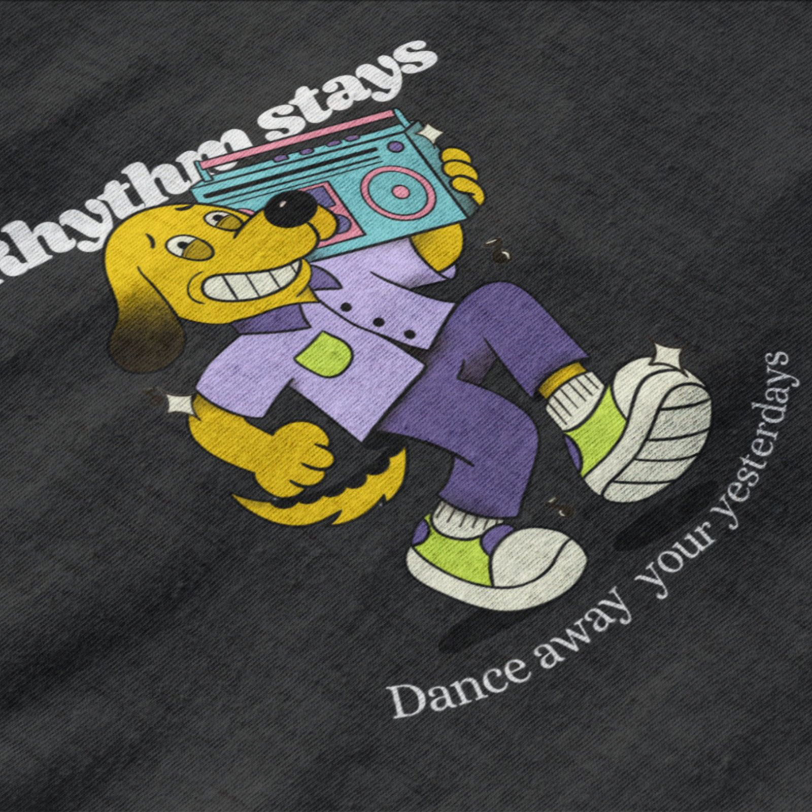 The Rhythm Stays T-Shirt is pure movement—playful, bold, and impossible to ignore. With a dancing dog and a boombox blasting good vibes, this tee is a reminder that echoes fade but rhythm always stays. Soft heather grey cotton meets oversized comfort, making it perfect for late-night jams, city strolls, or just losing yourself to the beat of your own day. Designed for dreamers, movers, and anyone who believes yesterday’s weight can be danced away, Regalioso turns rhythm into wearable art. Put it on, turn it up, and let your style move as freely as you do.
